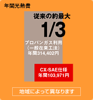 | CX-SAEと一般在来工法と光熱費を比べてみると、在来工法住宅がプロパンガスを利用の場合、年間で約21万円(都市ガス利用でも17万1千円)もお得。最大で約1/3の光熱費で済んでしまいます。 |