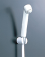 操作しやすい形状のサーモ水栓。金具本体が熱くならない昇温防止機能付きなので誰でも安心して使えます。また、使い勝手に合わせて角度を調整できるシャワーフックです。