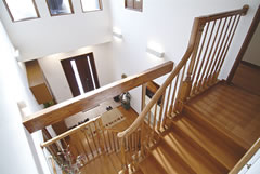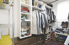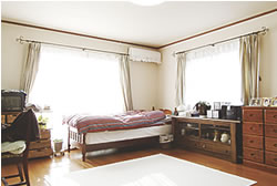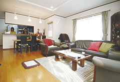 奥様は「今度の家はとにかく明るくしたい」と思い、採光性に配慮し、内外装の色調を明るいトーンで統一されました。また、「家は入ったときの印象が大事ですね」と吹き抜けの玄関に化粧手すりの回り階段を設置。玄関をより広く優雅に演出しています。増えた物は床下や階段下、ウォークインクローゼットなどにすっきり収納。快適な生活を楽しんでいらっしゃいます。 |